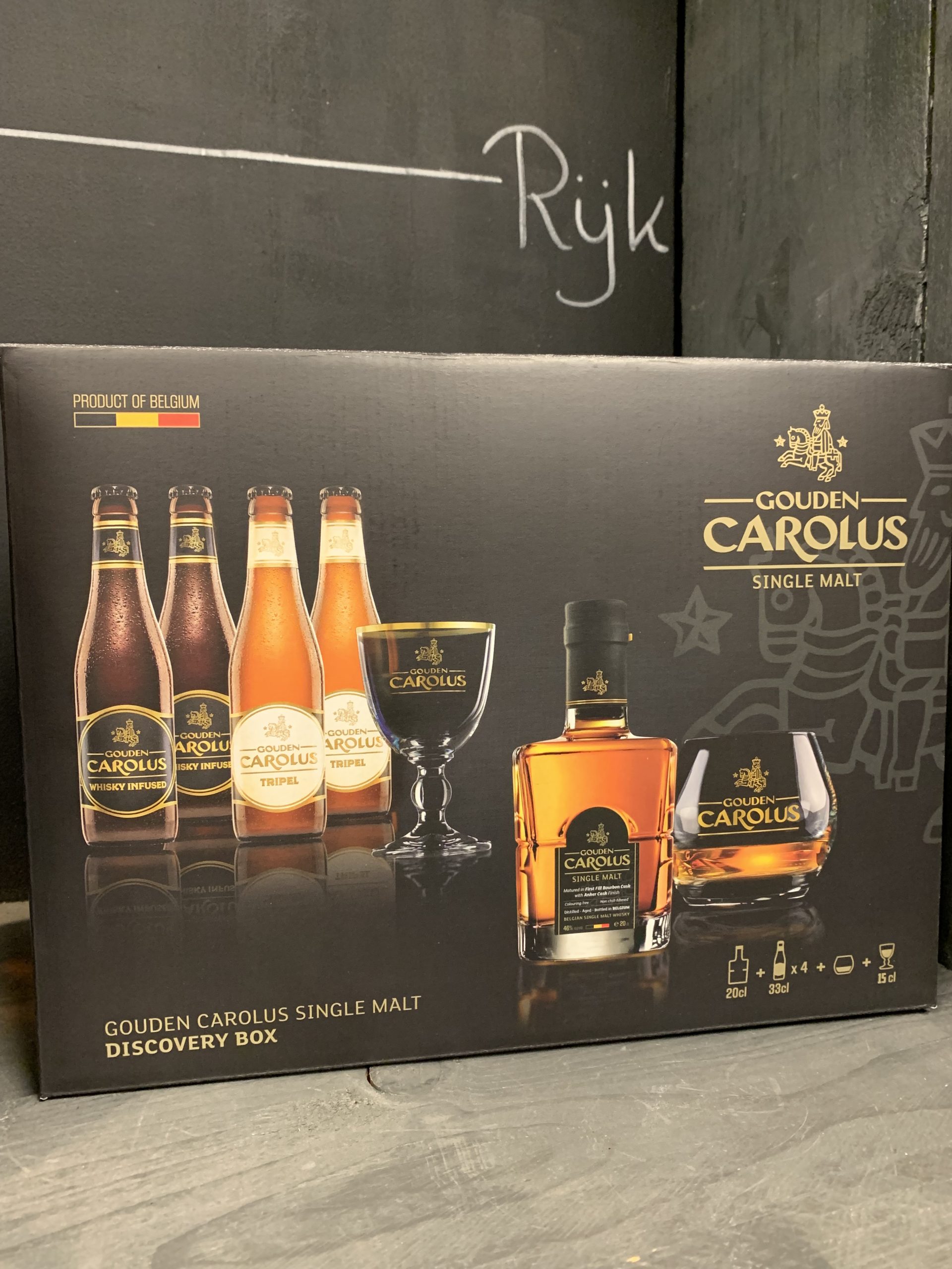 | Inhoud | 1x Whisky 20cl, 4x Tripel 33cl, Bier glas, Whisky glas |