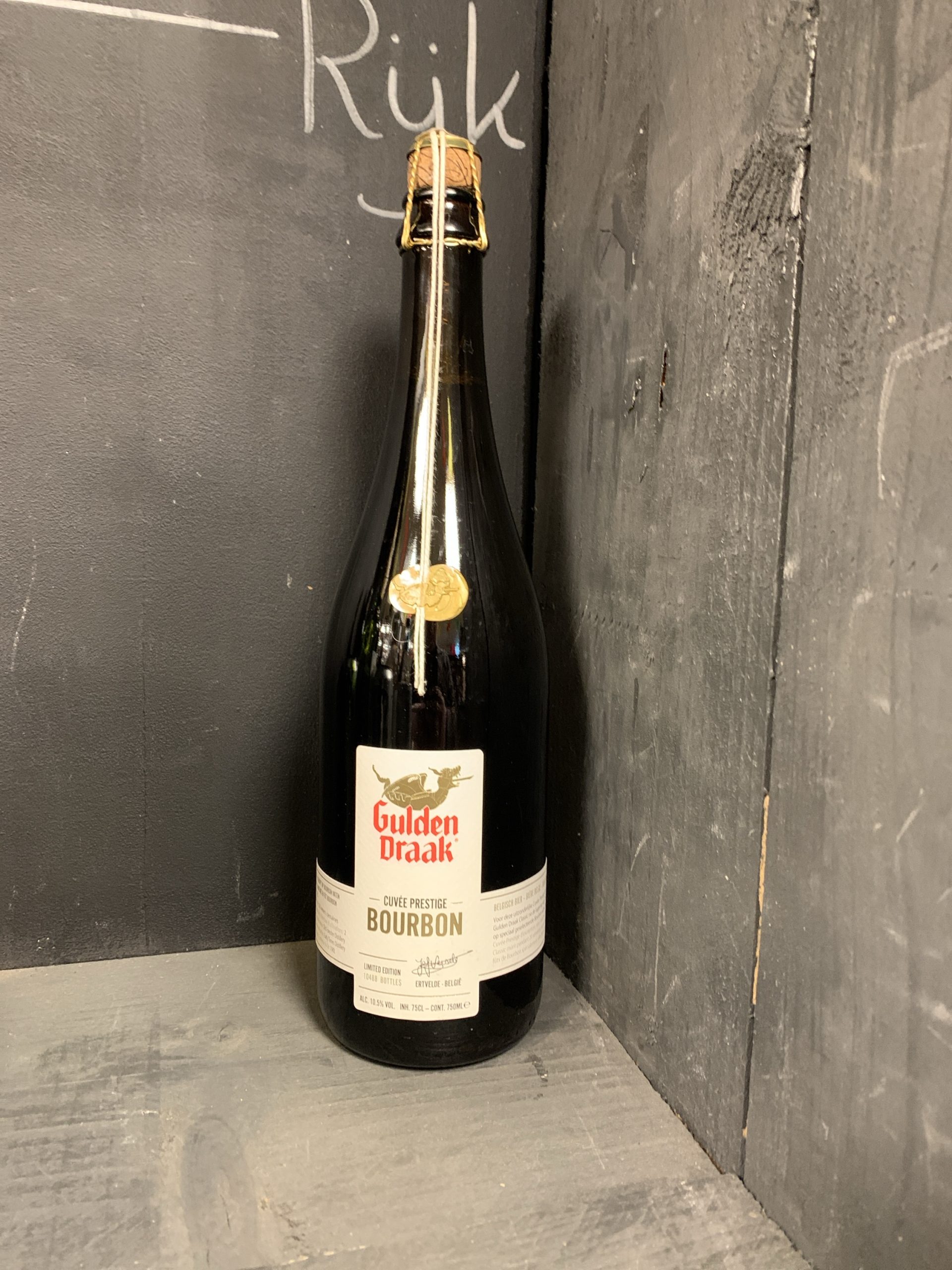 Gulden Draak Cuvée Prestige Bourbon Barrel Aged is een rijk en elegant Belgisch speciaalbier van 10,5%, waarin de krachtige basis van Gulden Draak Classic wordt verrijkt door rijping op Amerikaanse bourbonvaten. Tijdens deze vatlagering ontwikkelt het bier verfijnde houttoetsen met warme aroma’s van vanille, kokos en lichte karamel, afkomstig van het eikenhout en de bourbon. In de smaak proef je een harmonieus samenspel van zoete mout, gedroogd fruit, toffee en chocolade, gevolgd door zachte bourboninvloeden die zorgen voor extra diepgang zonder te overheersen. De volle, romige body en aangename alcoholwarmte leiden naar een lange, fluweelzachte afdronk waarin zoet, hout en spirit perfect in balans zijn. Gulden Draak Cuvée Prestige Bourbon Barrel Aged is een uitgesproken genietbier voor liefhebbers van barrel aged speciaalbieren met een rond, toegankelijk en luxueus karakter.